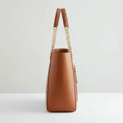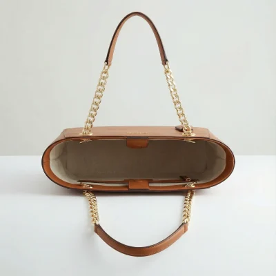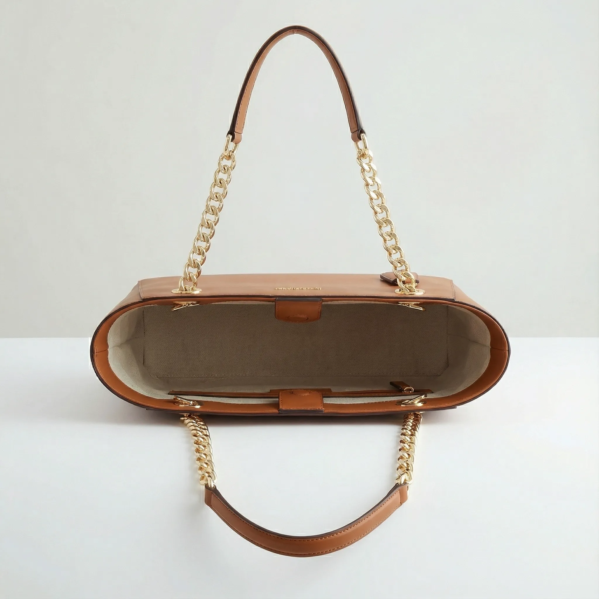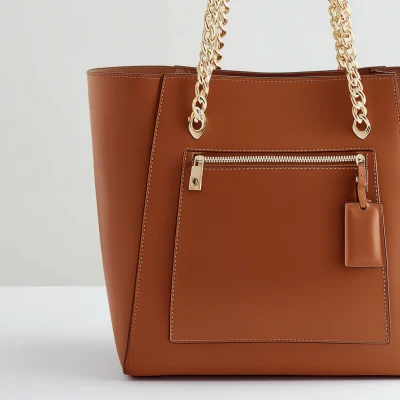 This structured tote is defined by clean lines and a rich amber finish, accented with polished chain handles that add a subtle touch of sophistication. The front zip pocket brings both visual balance and everyday practicality.