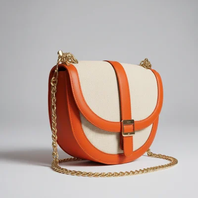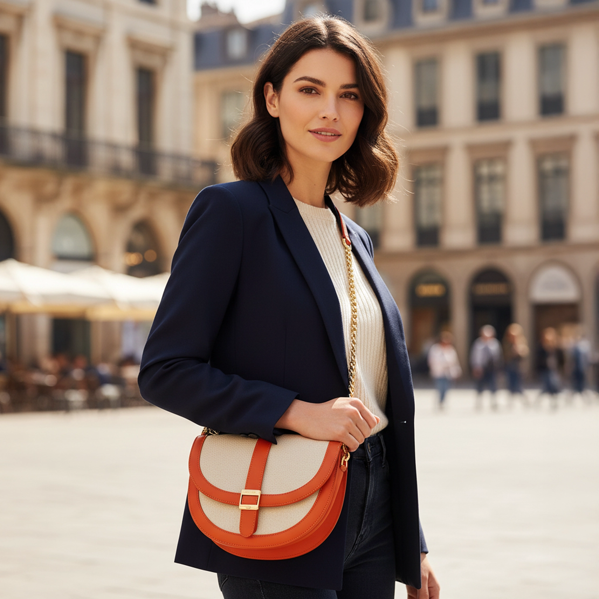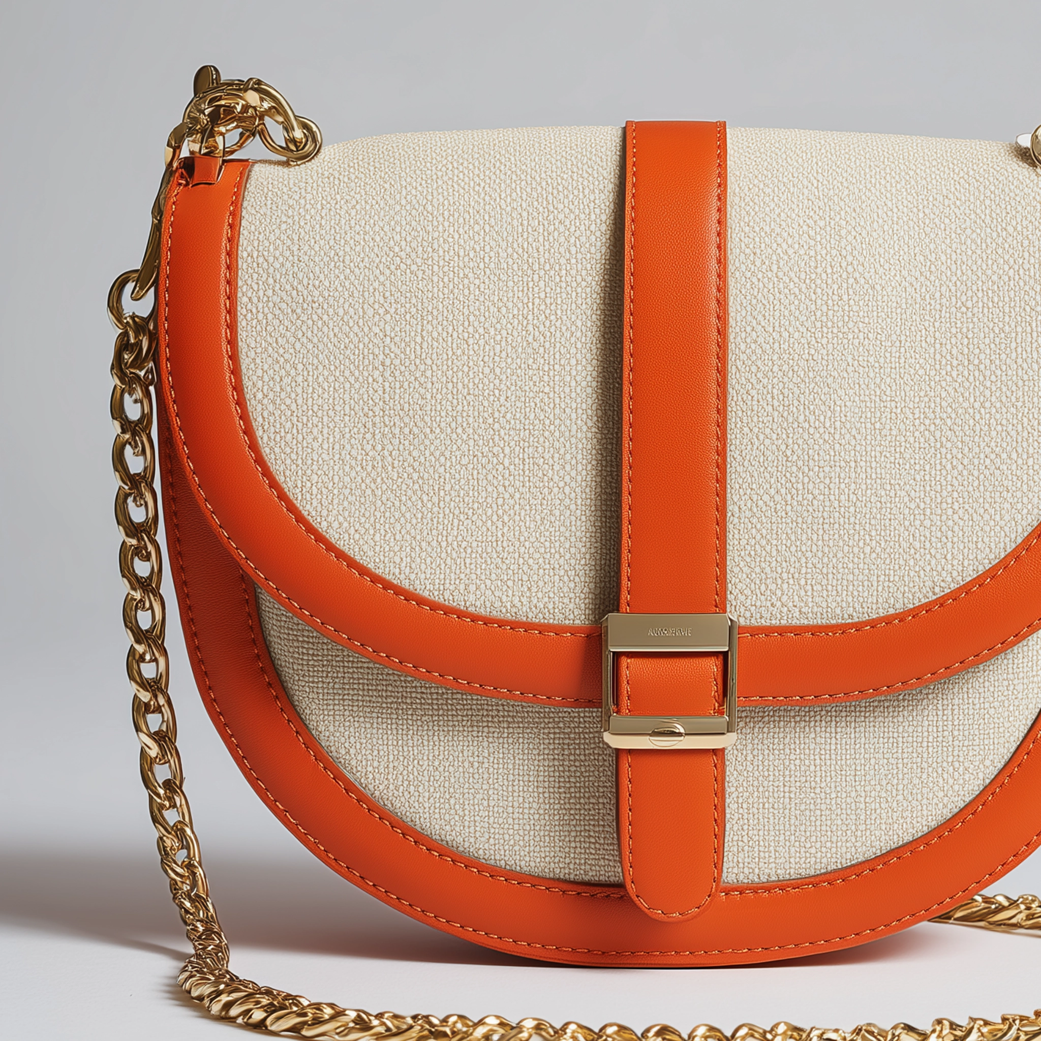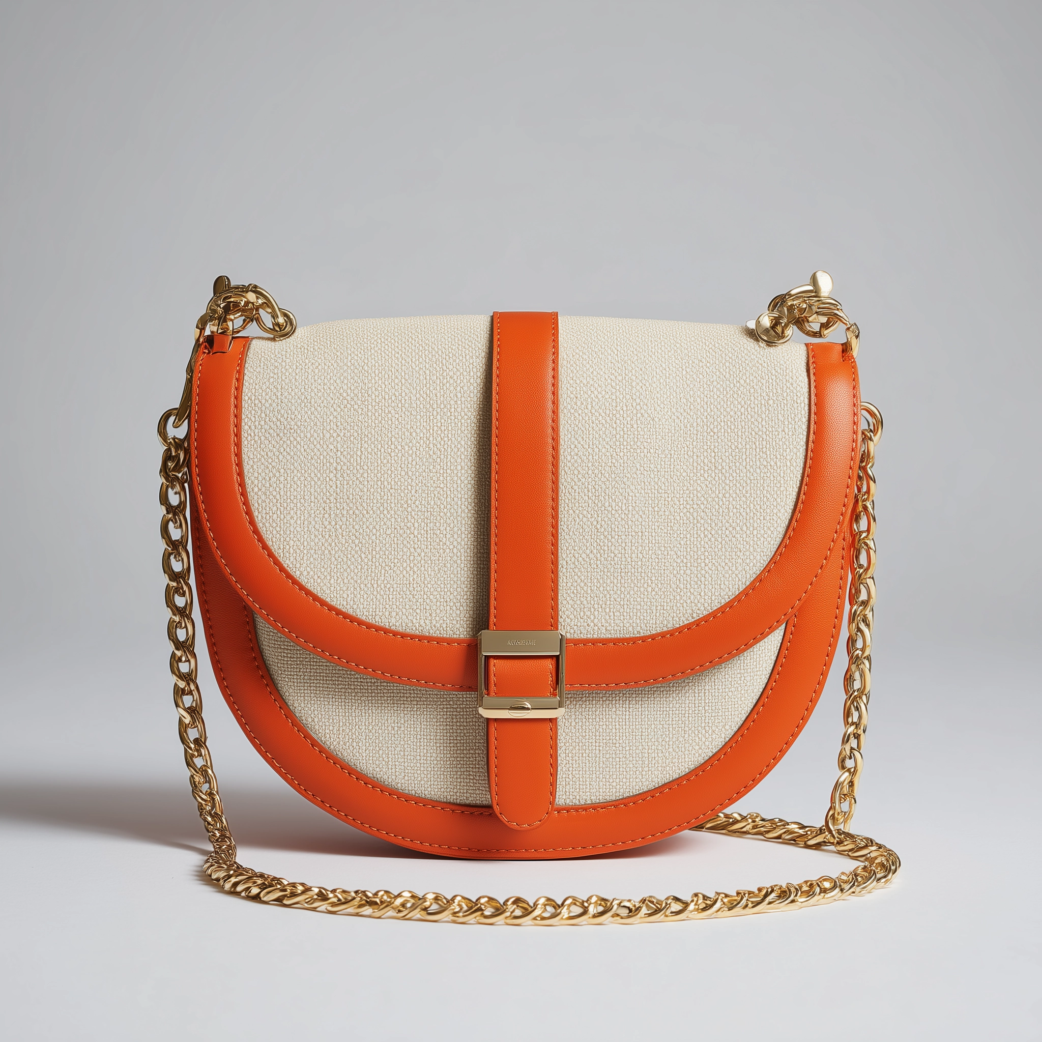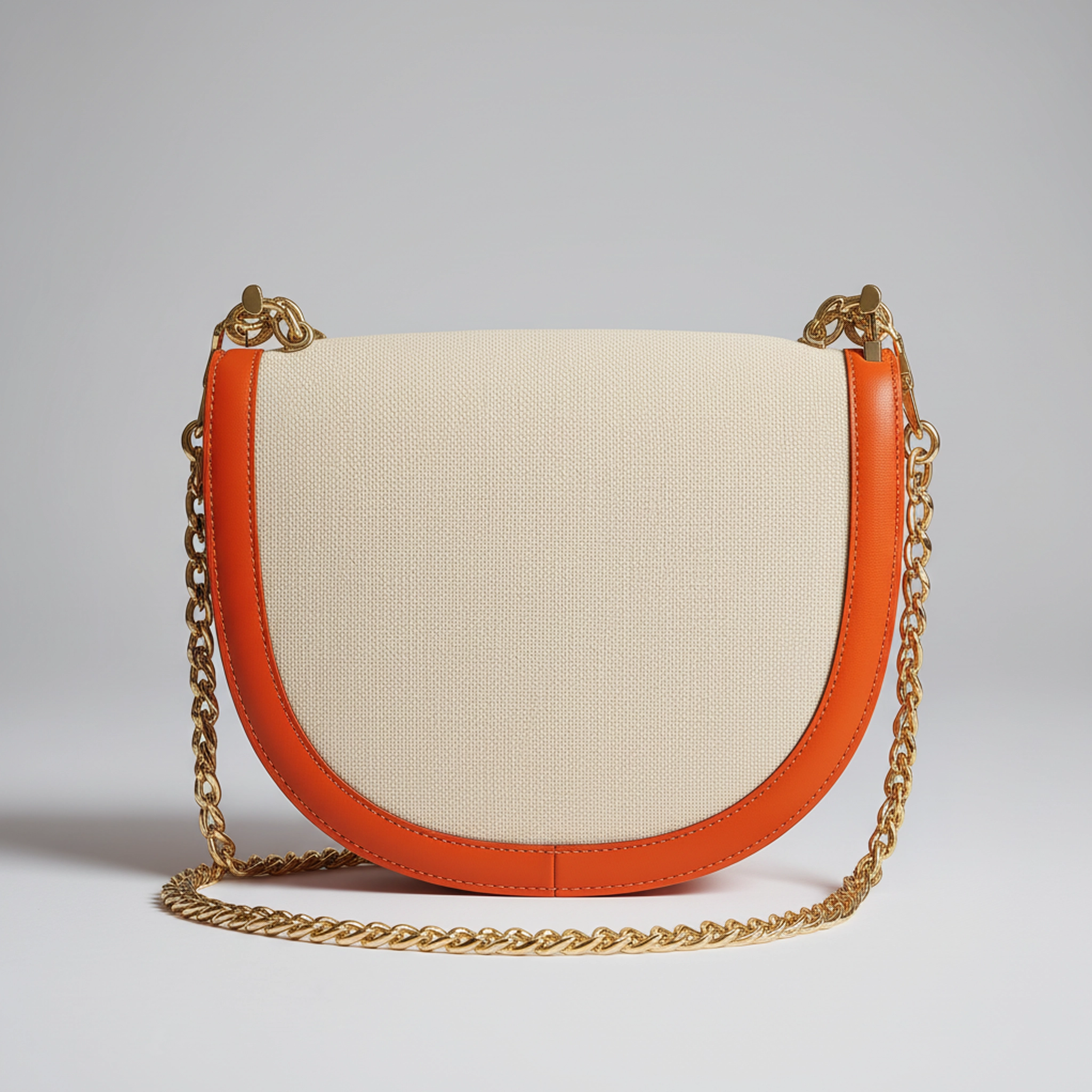 This crossbody bag features a balanced contrast between a natural canvas body and smooth orange leather trim, creating a fresh yet composed look. The curved flap design is centered with a slim leather strap and metal closure, adding structure without excess detail.