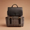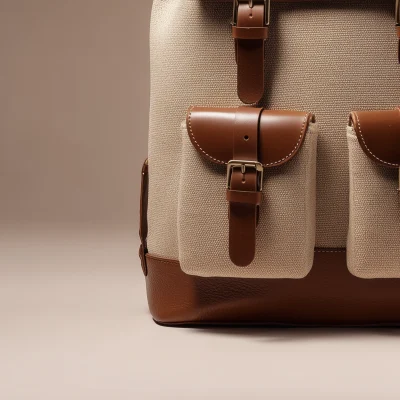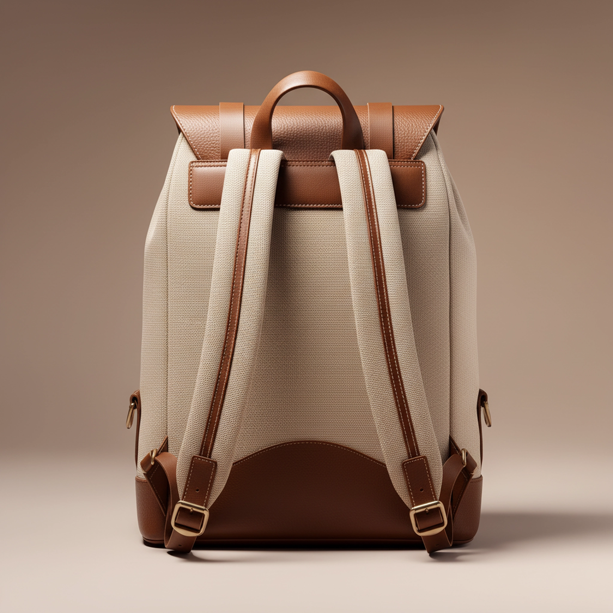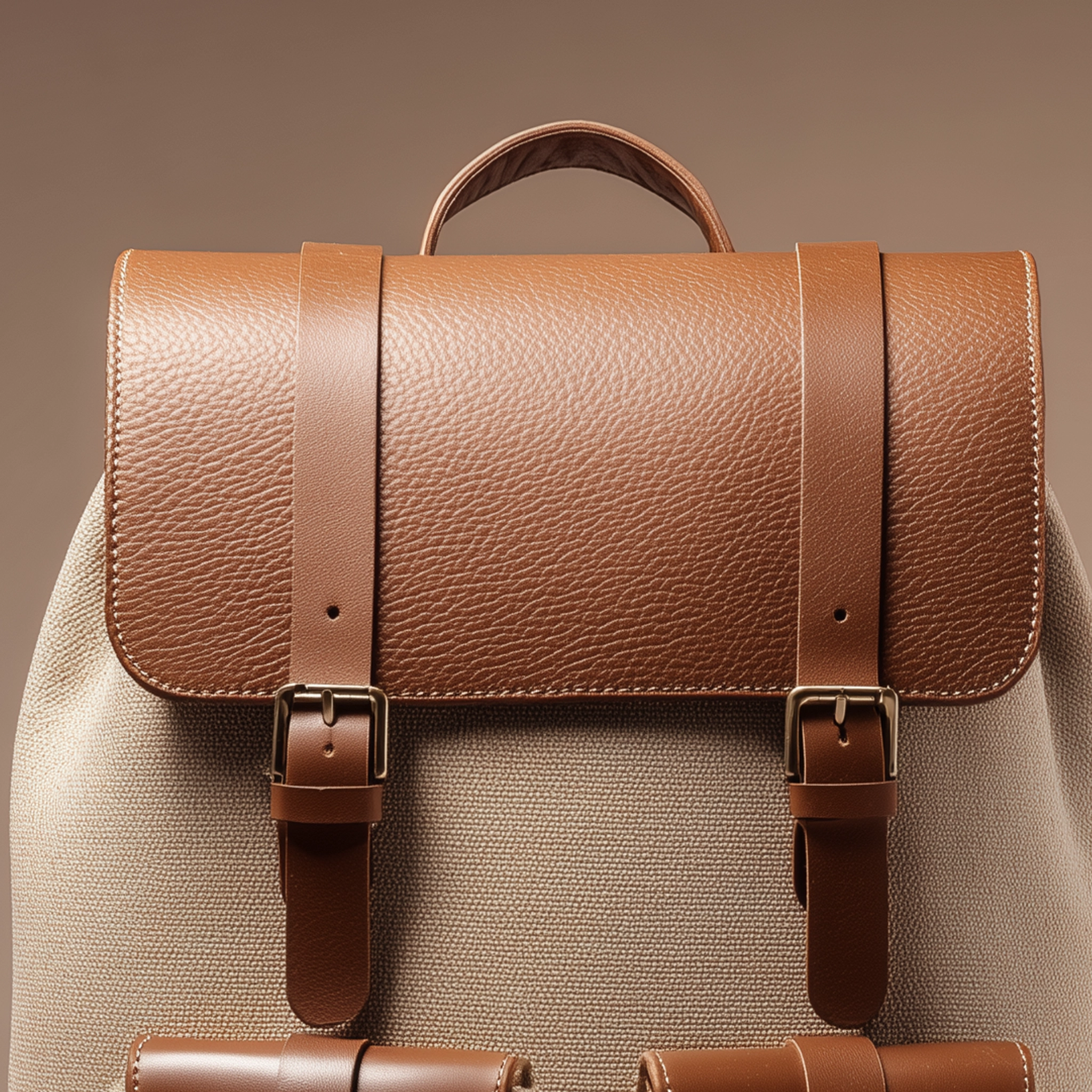 A structured backpack combining durable canvas with smooth leather accents and functional front pockets.