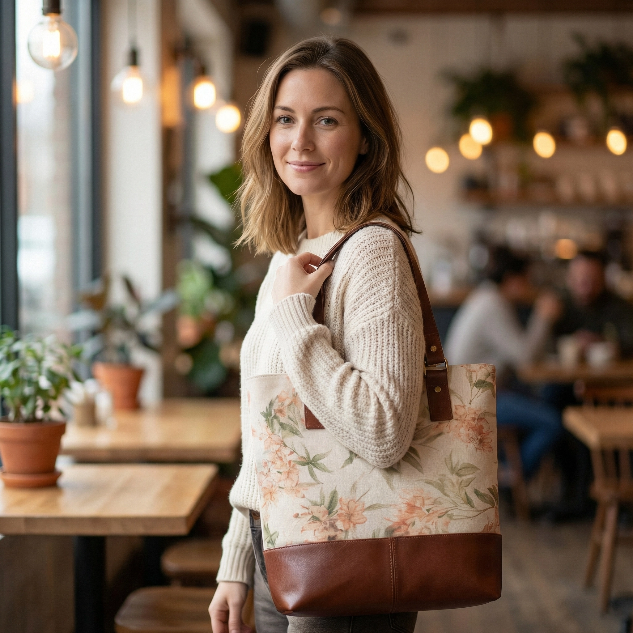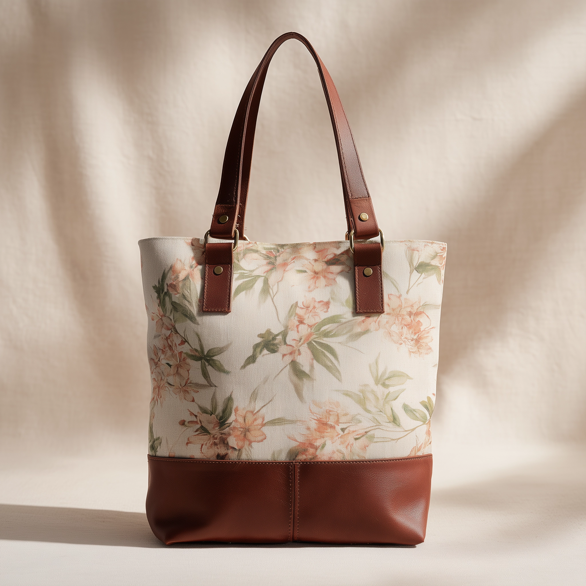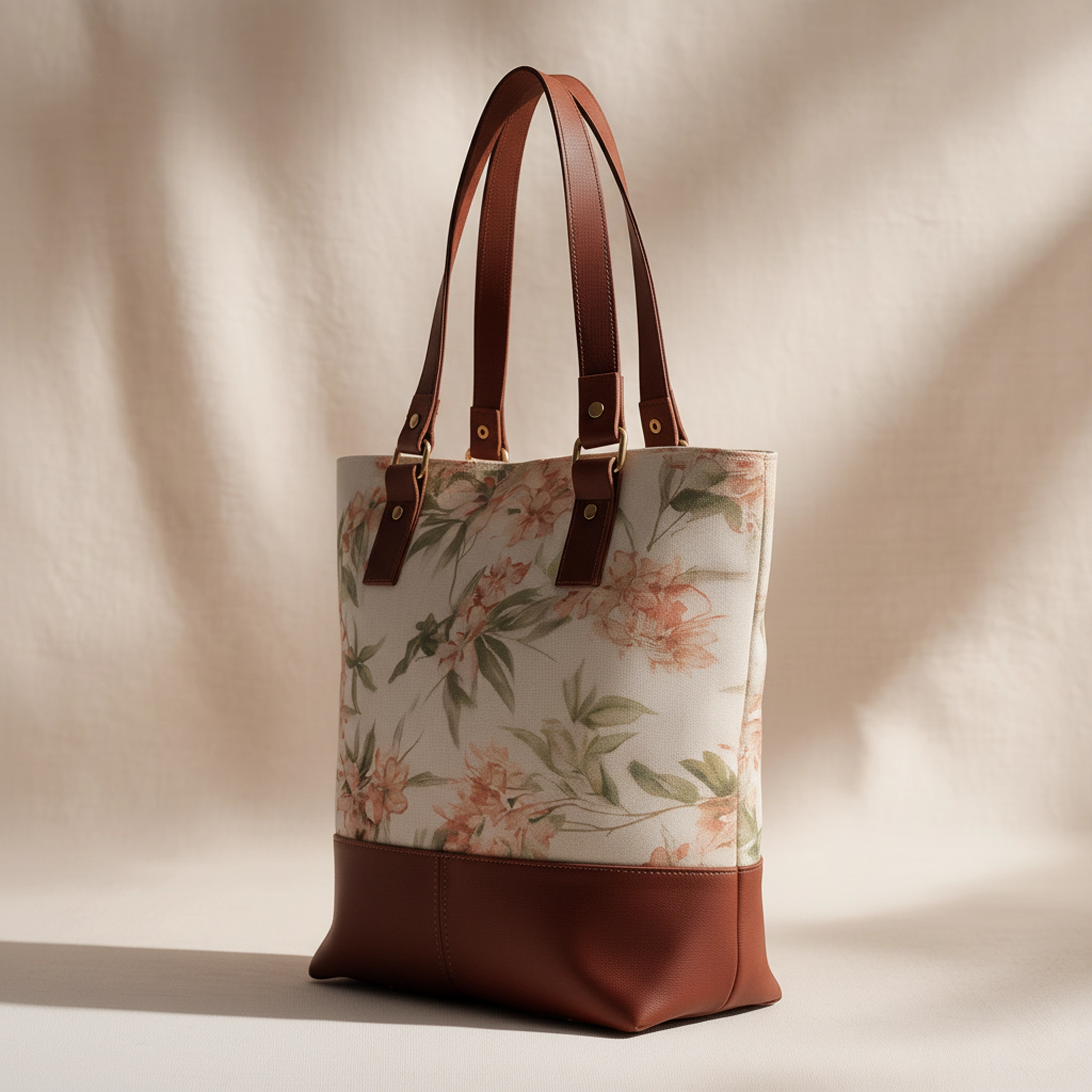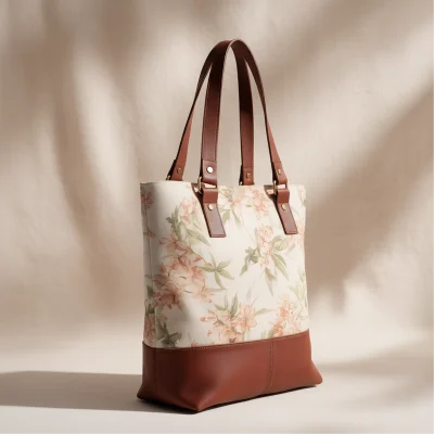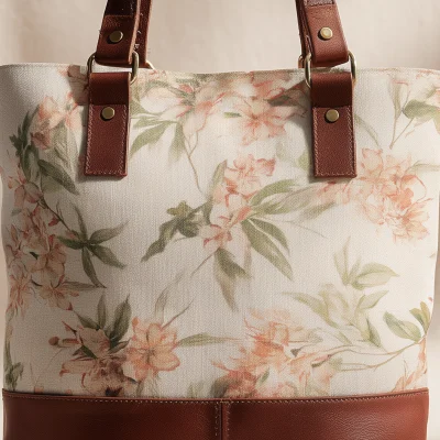 This tote combines a delicate floral pattern with clean, practical construction. The canvas upper brings a gentle, natural feel, while the solid leather base adds structure and visual contrast, keeping the silhouette composed.