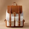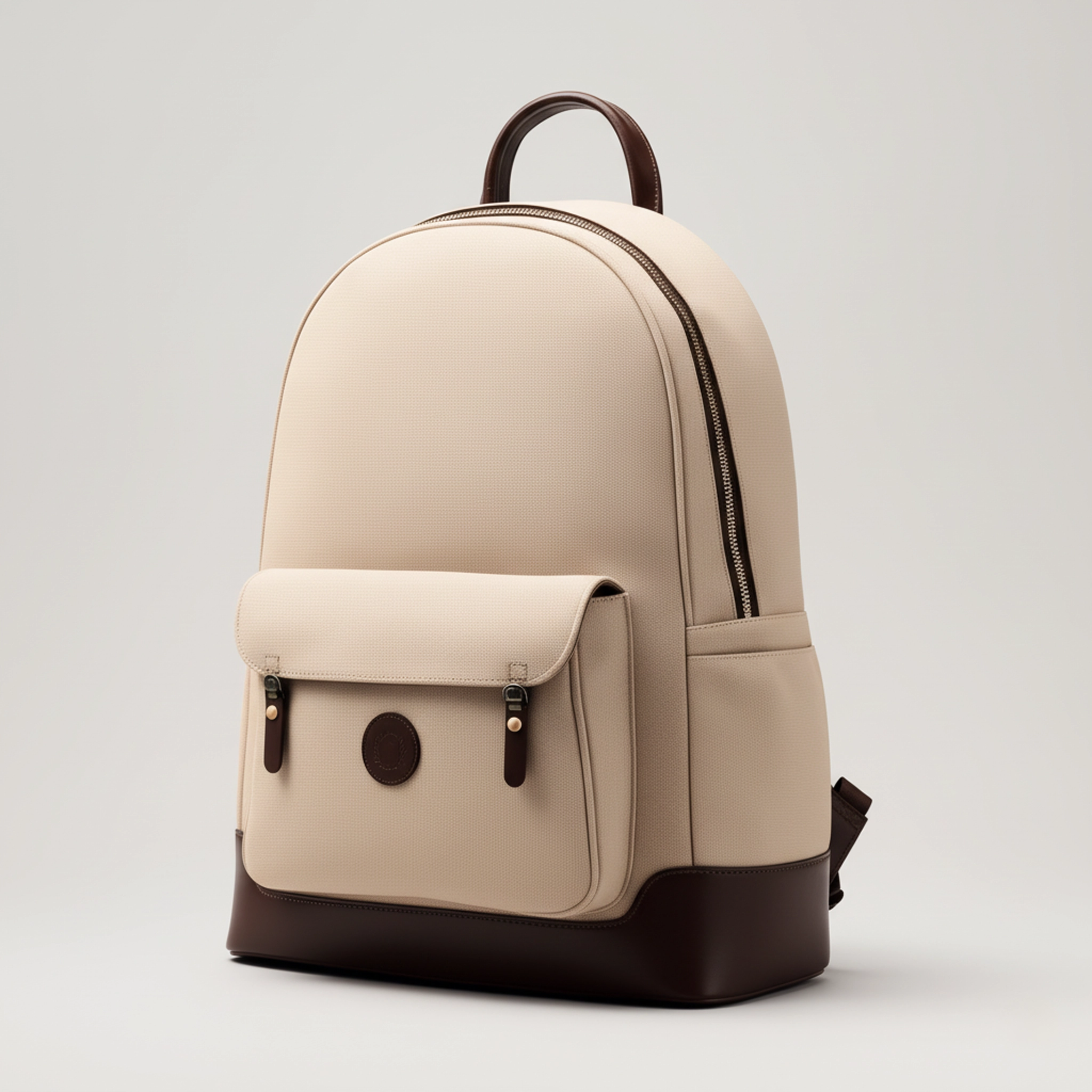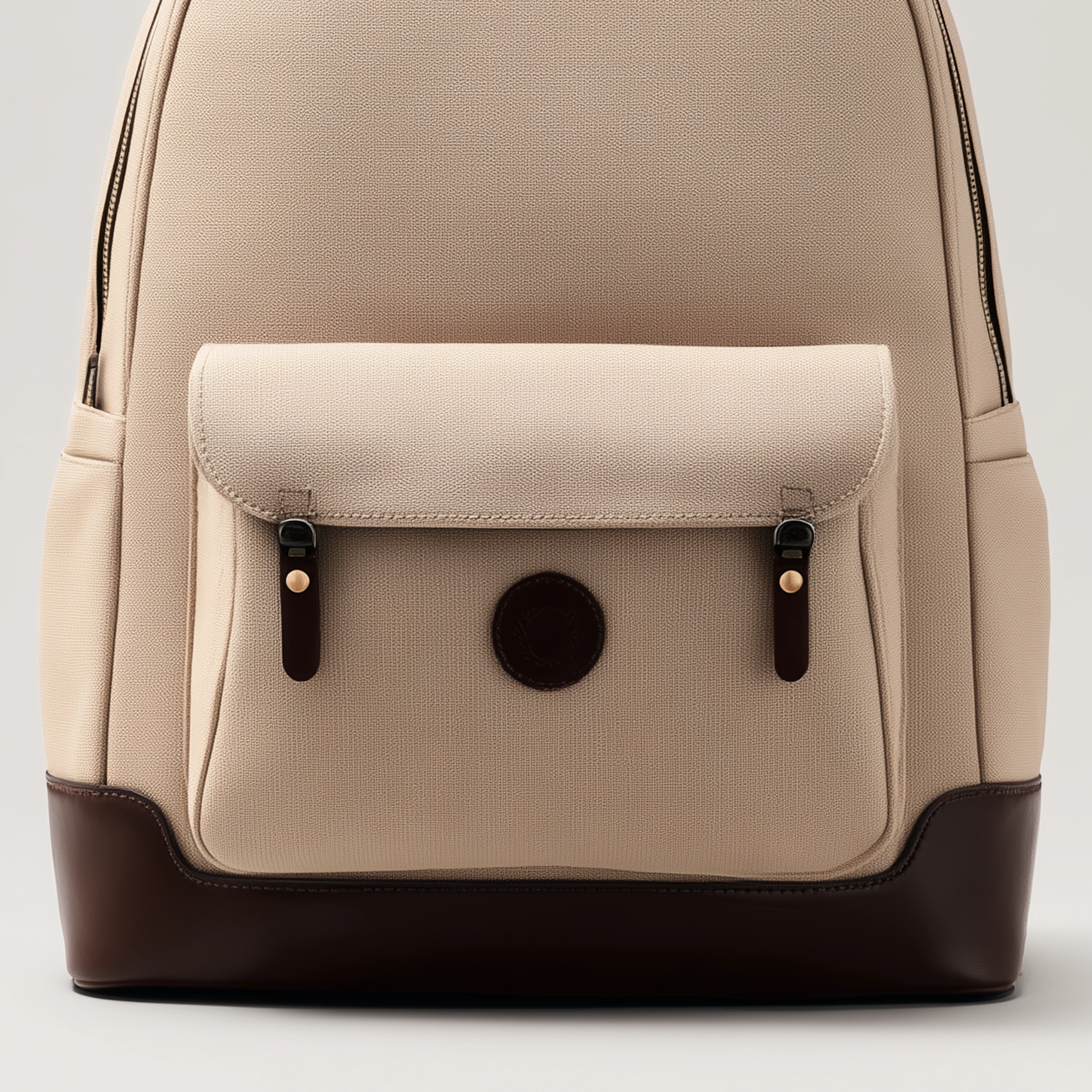 This backpack pairs a soft canvas body with subtle contrasting details to create a balanced and understated form. The rounded shape and front pocket offer both visual harmony and practical storage without overwhelming the design.