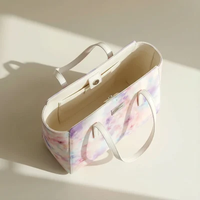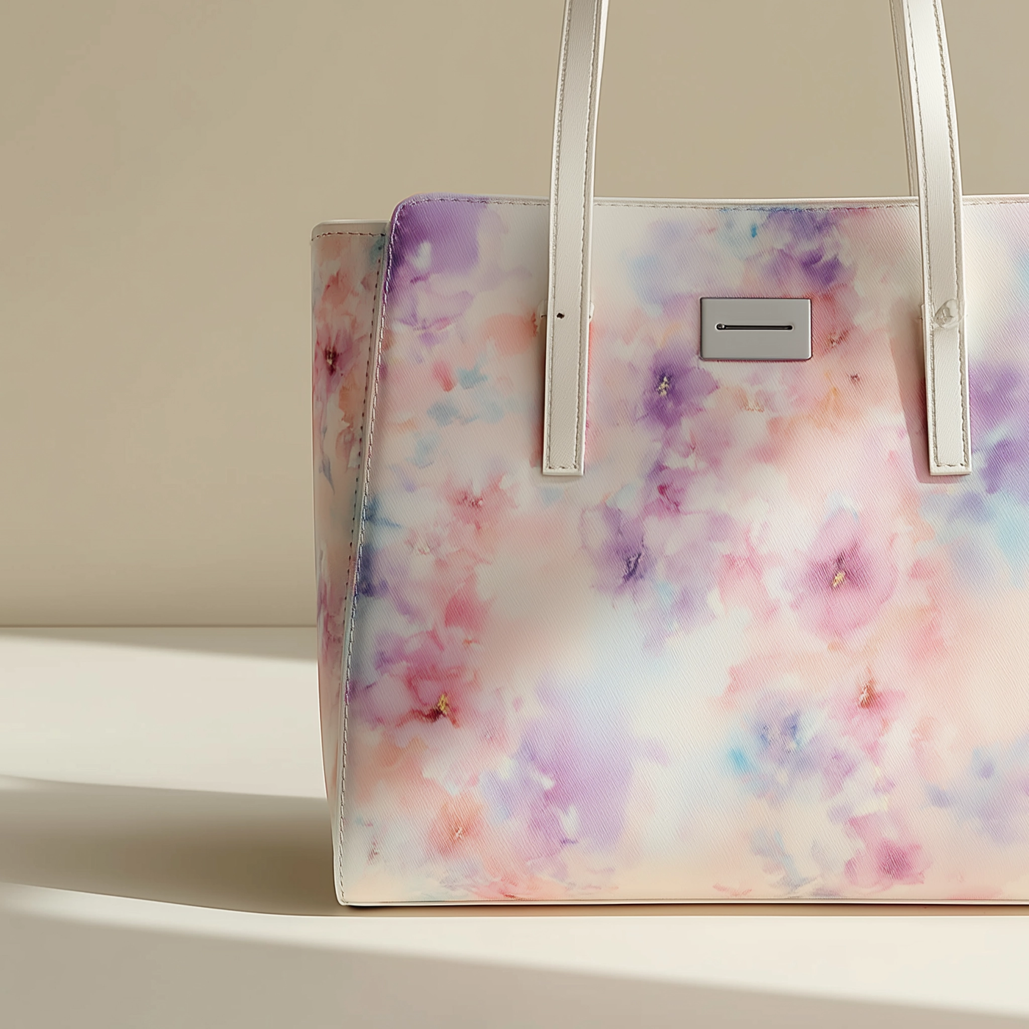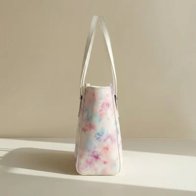 This tote showcases a delicate blend of pastel hues arranged in an abstract, floral-like pattern that adds visual depth without overwhelming the design. Its structured silhouette keeps the bag looking composed while offering practical space for daily essentials.