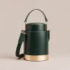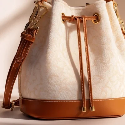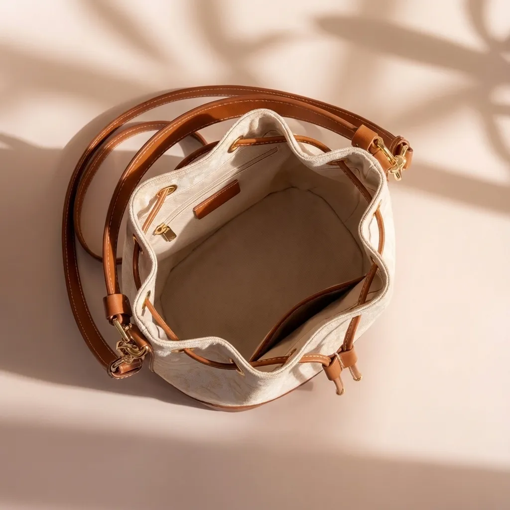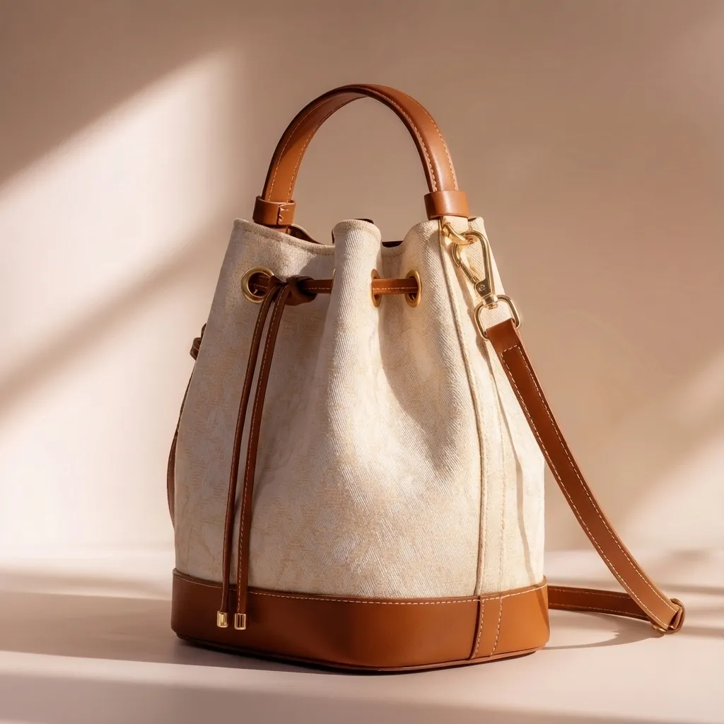 A soft bucket bag featuring a drawstring closure and warm leather accents for everyday elegance.