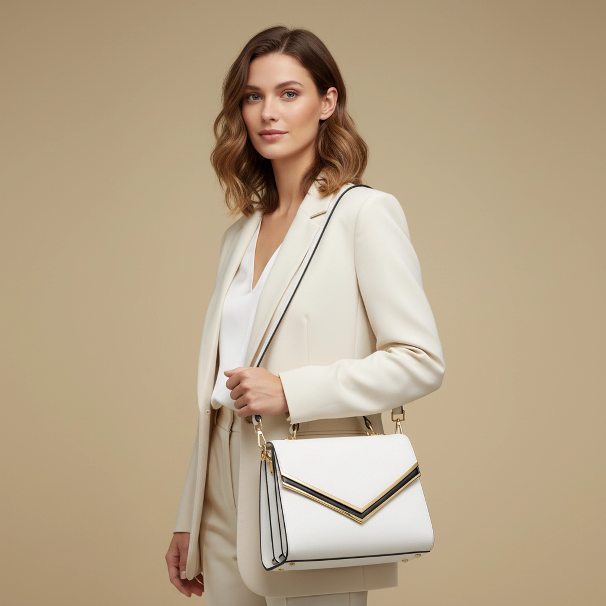 This bag is defined by its sharp lines and architectural form, highlighted by a contrasting chevron-shaped metal accent that adds a subtle focal point without overwhelming the design. The structured body keeps its shape, creating a composed and balanced appearance.