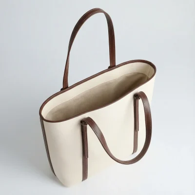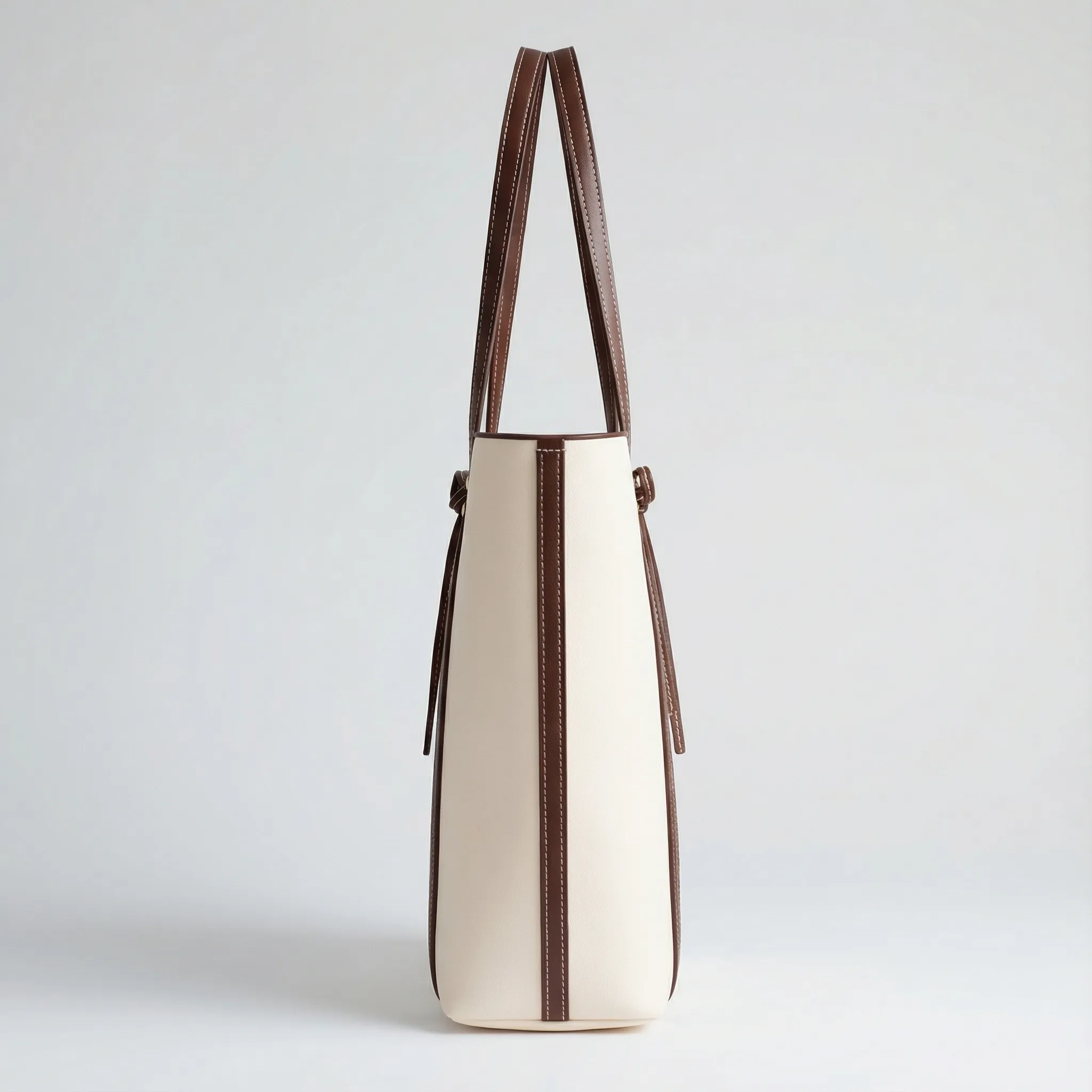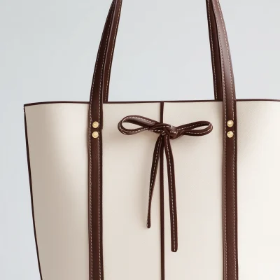 This tote balances minimal form with subtle detail, combining a light-toned body and contrasting leather trim for a composed, modern silhouette. The vertical lines and center tie accent add gentle structure without overwhelming the design.